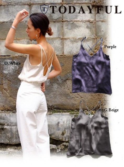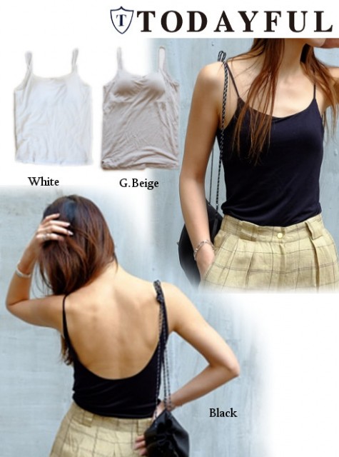 広く開いた背中が女性らしいキャミソールは取り外しが可能なカップ付き、