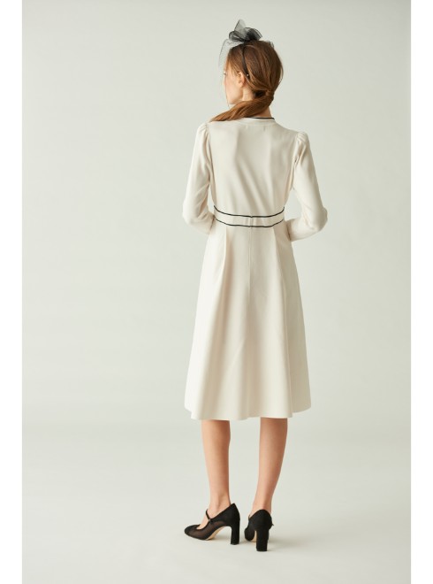 襟付きの清楚なワンピースは落ち着いた色合いで品良い1枚