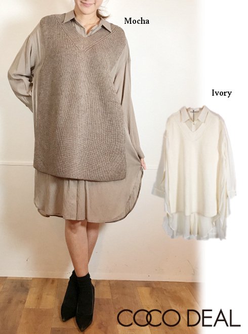 Vネックのニットベストをレイヤードしたかのようなニットドッキングロングシャツ