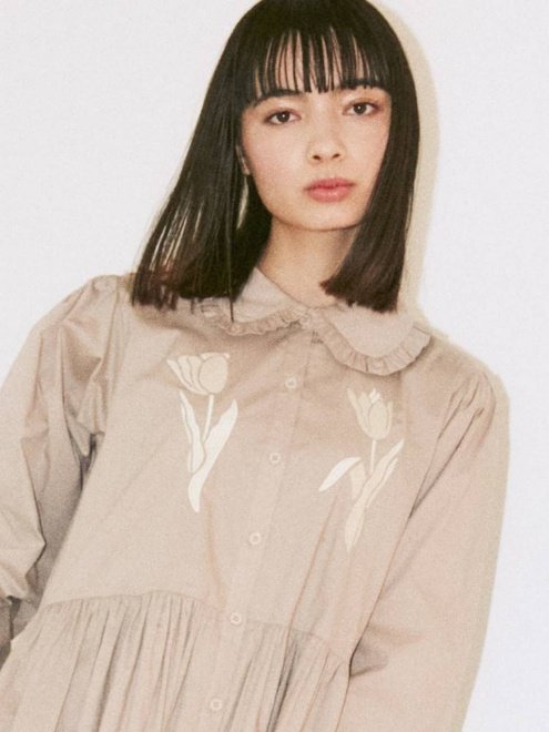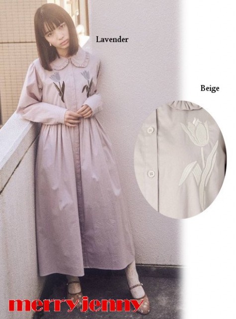 チューリップの刺繍がフロントを彩り、春らしさ満点のワンピは