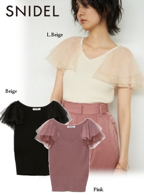 光沢のあるチュールと無地のチュールを4層に重ねてギャザーとタックでフリルスリーブを表現したニット。