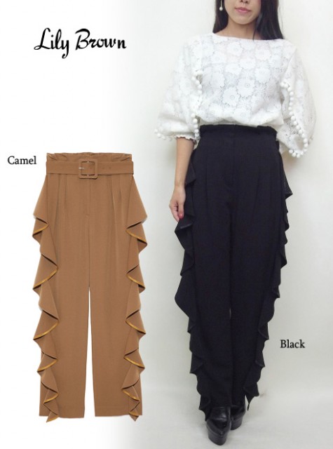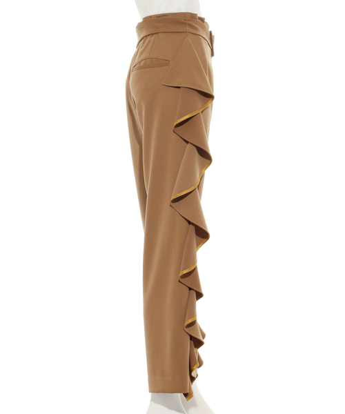 ひらひらと優雅に流れ落ちるサイドのラッフルフリルが、スタイルを印象深く演出するパンツ。