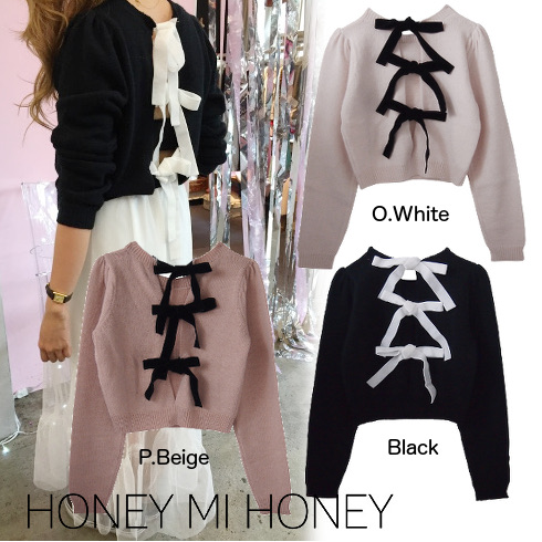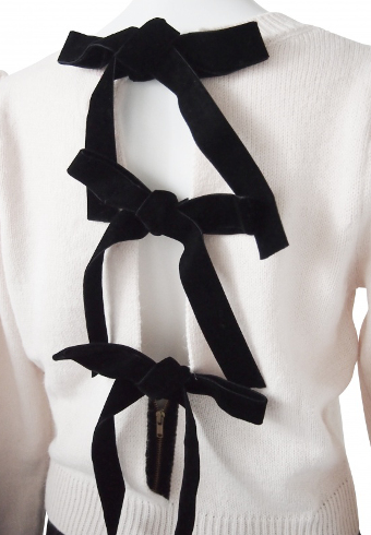 大胆なカッティングデザインのバックスタイルを大きなベルベットリボンで結んびガーリームードを高めたニット。