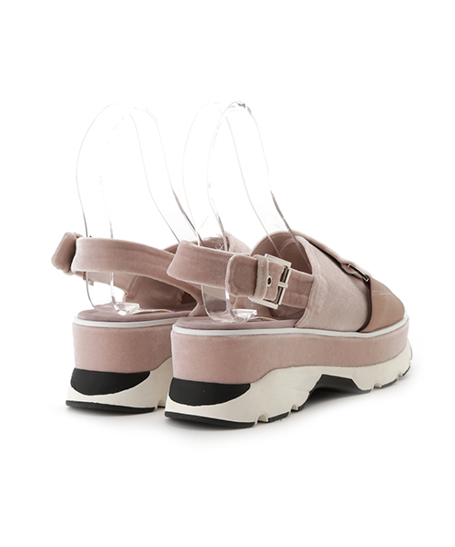 アクティブな印象のサンダルをベロア素材にアレンジしたところが、大人らしく映える秘訣。