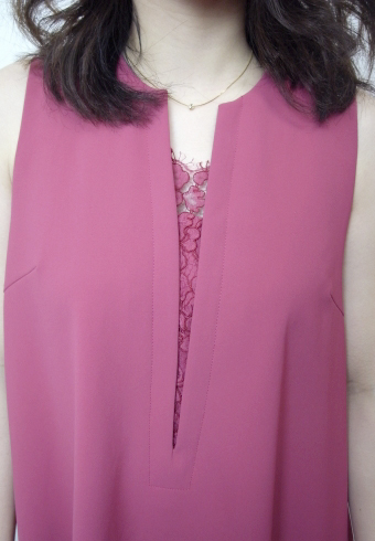 シャープで細めの深いVスリットの間に、華奢なスカラップレースを挟み込んだAラインワンピース☆