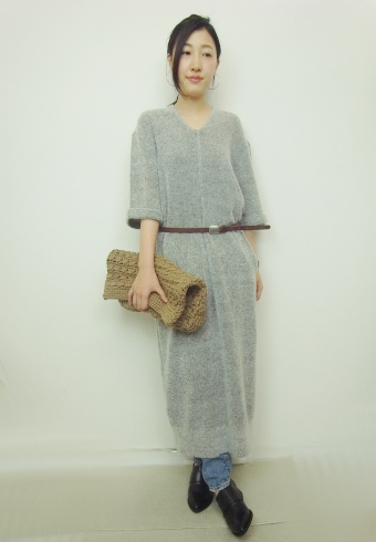 適度に身体にフィットする柔らかな素材感と、Vネックのざっくりとしたシルエットが可愛いニットワンピース。