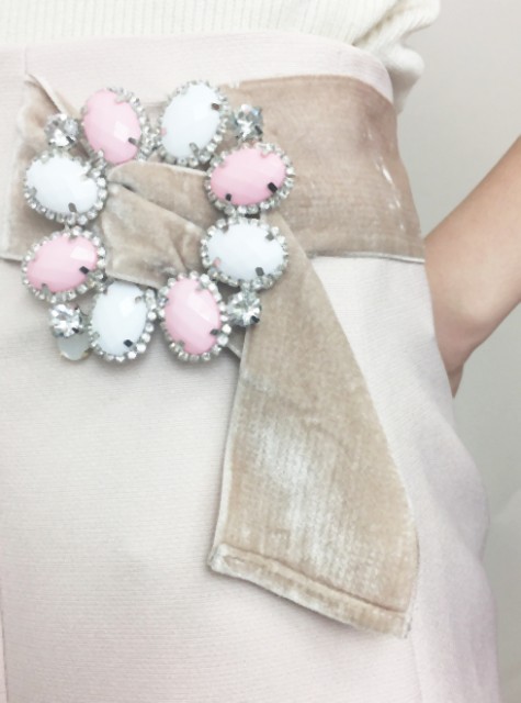 ウエストにあしらわれた、存在感抜群のビジューバックルとベロア調のベルトが着こなしを華やかに彩ります!