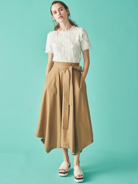 落ち感のある軽い素材で仕上げ、歩くと揺れるアシンメトリーデザインのフレアースカート