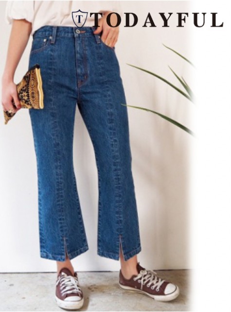 裾にスリットが入ったデニムはひざ下にかけて少しフレアになっているデザイン。