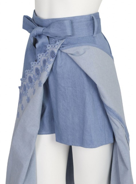 スカラップのラインに刺繍をあしらった、フェミニンなデザインのダンガリースカート