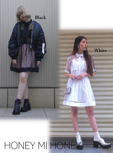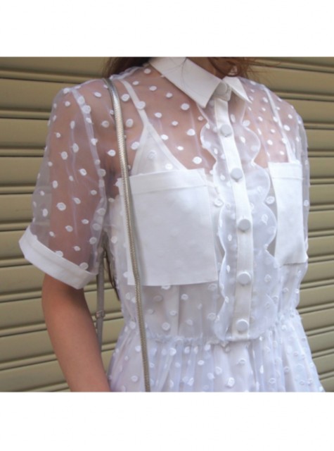 透け感のある素材にデザインされたドット柄が、どことなくヴィンテージ感を醸し出しているワンピースドレス。
