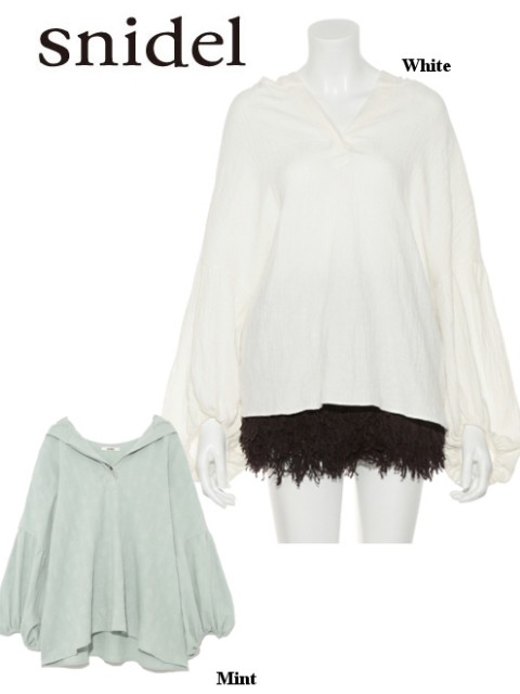 裾のドローストリングリボンでアレンジ自在に楽しめます。肩のボタンを外すと肌見せもできる、技アリな一枚です。