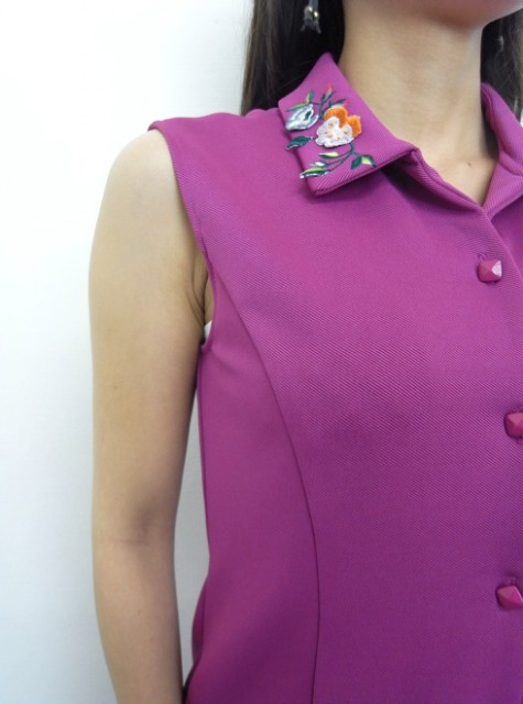 程良く肩幅を持たせたフォルムやスクエア形のボタン使いが、雰囲気を盛り上げます。