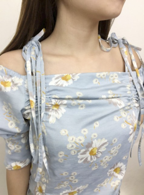 大胆なデイジー柄をデザインした華やかなオフショルダートップス。