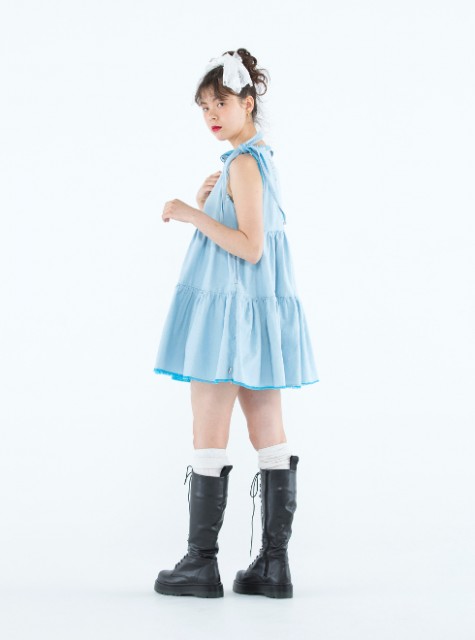 ハイウエストから落ちるAラインシルエットとリボンのついた肩紐でガーリーな雰囲気のワンピース。