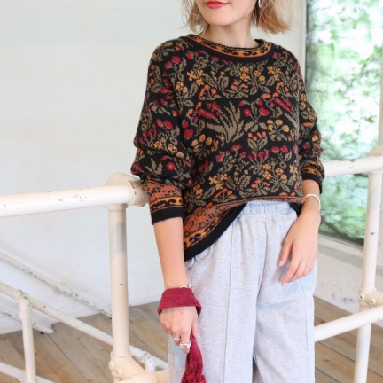 オリジナルの花柄をヴィンテージライクな色味に編みたてたジャガードニット。
