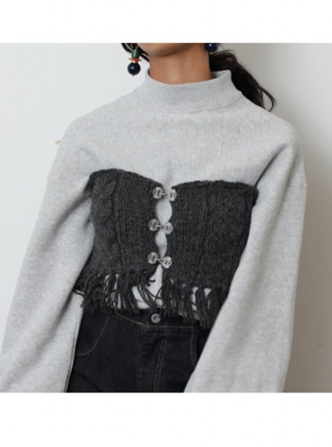 フリンジとフロントのコンチョフックがポイントのニットビスチェ。
