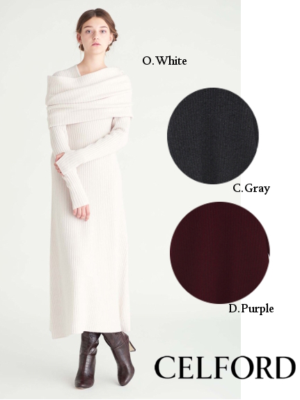 ボリュームのあるスヌードをセットにしたニットロングワンピース