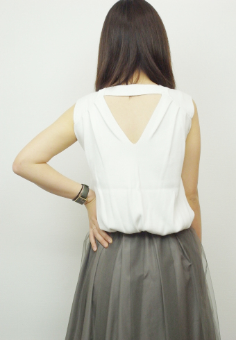 定番コーデになりがちなベーシックアイテムもバックの肌みせでアクセントに♪