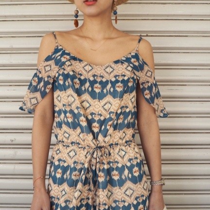 オフショルダーデザインが今年らしく夏の太陽に映えるカラーのコンビネゾンです。