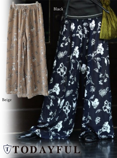 落ち着きのある配色やプリントデザインが大人っぽいウエストはゴム仕様なので楽に着用していただけ、