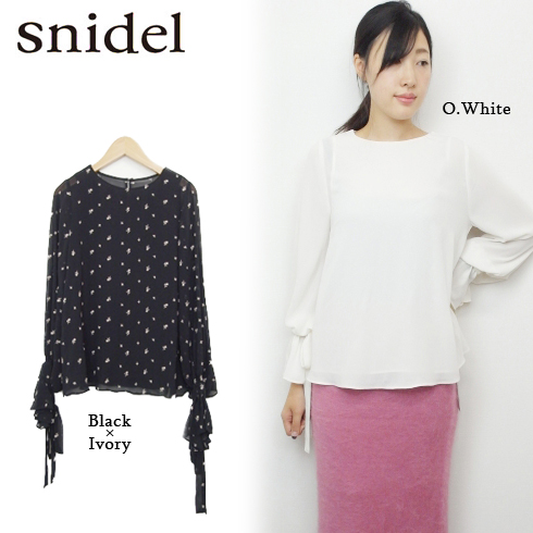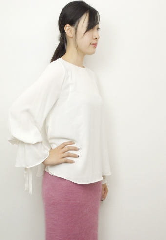 袖口をリボンでキュッと結んで、愛らしいアクセントを添えたプルオーバーブラウス。