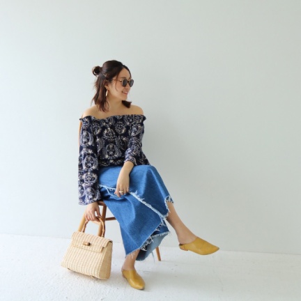 トレンドの短め丈のオフショルダートップスで取り入れ、華やかな一枚に仕上げました。