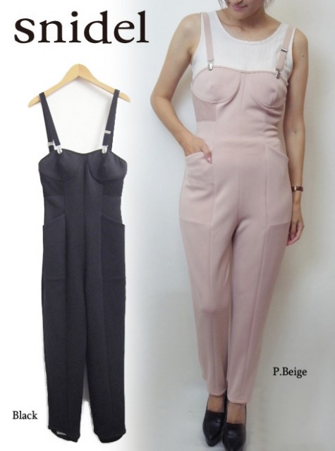 サスペンダー風の肩ストラップが、お洒落心をくすぐるオールインワン。
