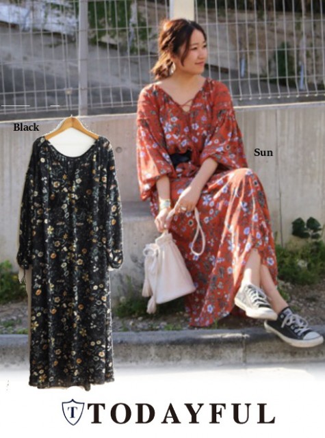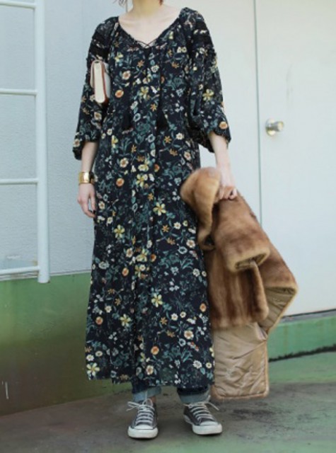 大人っぽい花柄が目を引くマキシ丈ドレス。