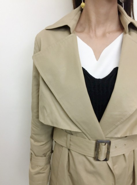 程良いハリとツヤがありながらもカジュアル見えし、さらっとガウン風に着れる、釦レスのトレンチコートです。