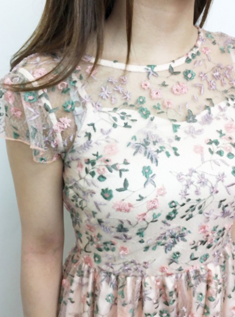 立体的な繊細刺繍が贅沢な一枚。デコルテ~肩の透け感もロマンティックな印象。