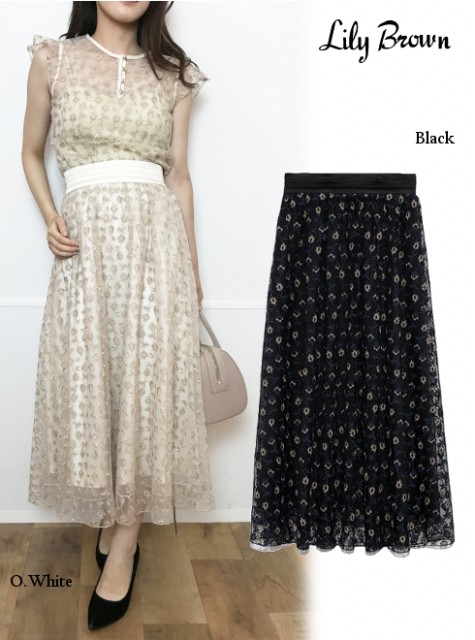 ラメ糸のフラワー刺繍を施したチュールが上品な煌めきを放つミディアム丈のスカート