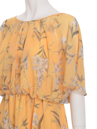 リゾートフラワー柄が可愛く、動くたびにふわっと揺れるシルエットが女性らしさを高めます。