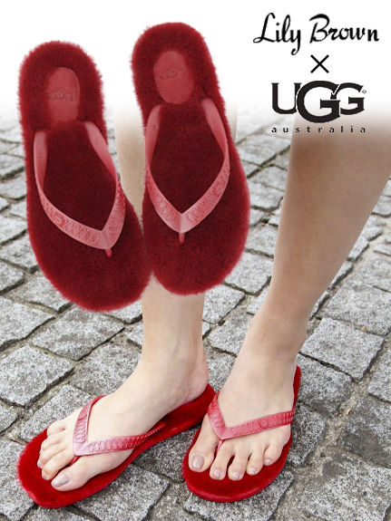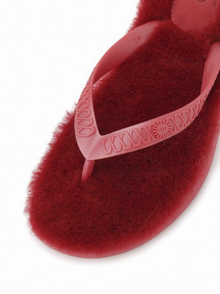 ふわふわ暖かなシープスキン素材を敷き詰めたリッチなビーチサンダル。UGG®の人気モデル〝Fluffie〟をLily Brownが得意とする差し色カラーのレッドで表現しました。