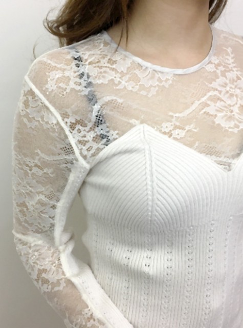ビスチェがドッキングされたような、デザイン性の高いニットトップスは、レース素材と合わせて繊細さをプラス。