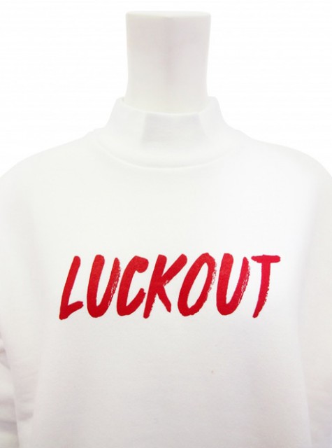 胸元のLUCK OUT(luckyのスラング)の刺繍は主張しすぎずさりげないポイントに。