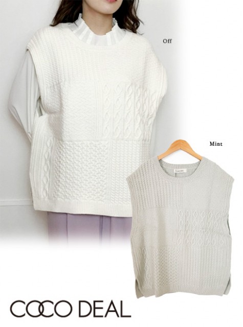 パッチワーク風ケーブル柄でリメイクニットのような個性的なニットに