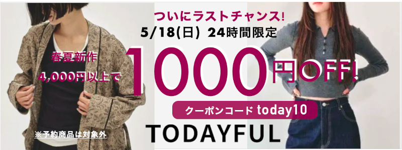 ついにラストチャンス!!【5/18(日) 24時間限定 】TODAYFUL 2025春夏新作が1000円OFF!! ルーズ感のあるシルエットが魅力のマニッシュデニムや今から使えるベストなどお得