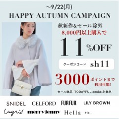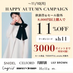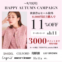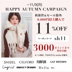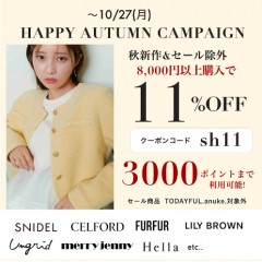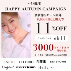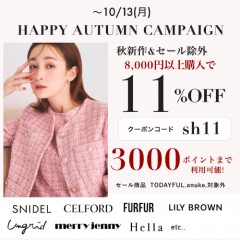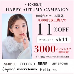 【 HAPPY AUTUMN CAMPAIGN START 】人気ブランドの 秋新作 & セール除外 が8,000円以上購入で ★なんと11%OFF&さらに3000ポイントまで利用可能★