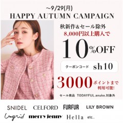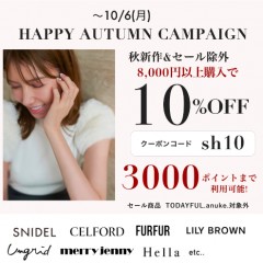 【 HAPPY AUTUMN CAMPAIGN START 】人気ブランドの 秋新作 & セール除外 が8,000円以上購入で ★なんと10%OFF&さらに3000ポイントまで利用可能★