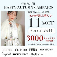【 HAPPY AUTUMN CAMPAIGN START 】秋冬新作&セール除外も8,000円以上購入で ★なんと11%OFF&さらに3000ポイントまで利用可能★~11/24(月)