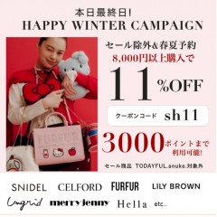 本日最終日【 HAPPY WINTER CAMPAIGN 】セール除外&26春夏予約も8,000円以上購入で ★なんと11%OFF&さらに3000ポイントまで利用可能★