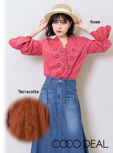 涼しげなコットン素材にスカラップ刺繍が季節感あふれるブラウス♪