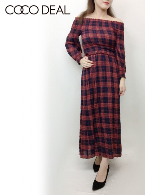 チェック柄シャーリングオフショルロングワンピース 14,040円