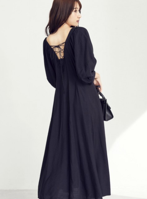 肩回りがスッキリ見えするパフスリーブ、コルセット風な胸下切替え、