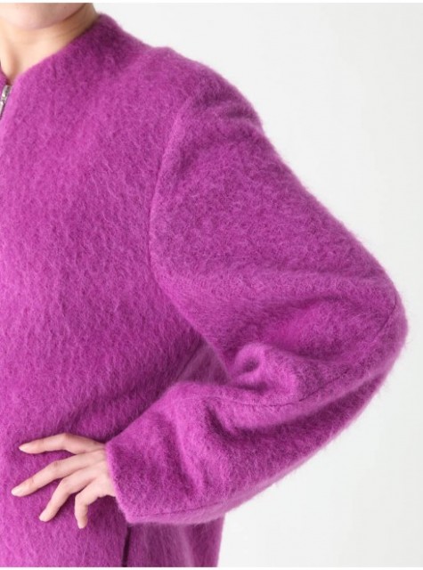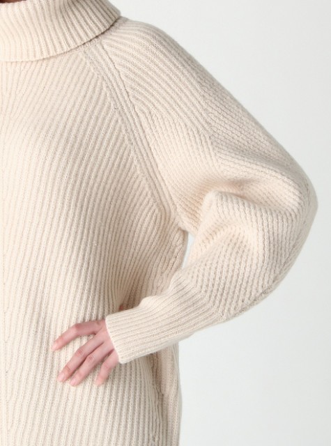 袖の立体的なボリュームフォルムと大き目のタートルネックが抜け感のある雰囲気に。
