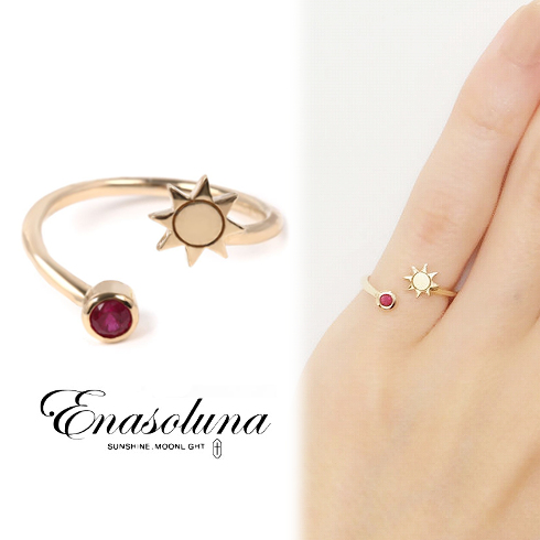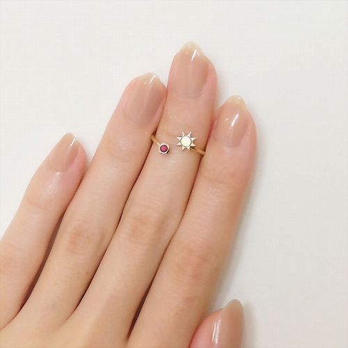 ルビーと太陽をモチーフにしたリングは手元のアクセントになるデザインです。