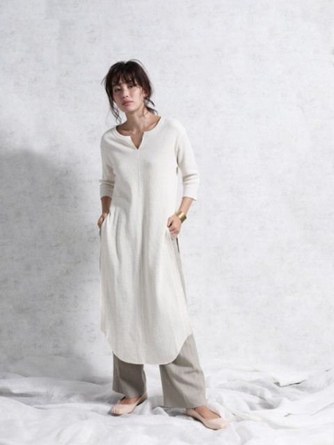 フロントのボタンを閉めてワンピースのように着こなしていただくのもおすすめです