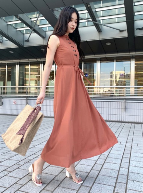 フロントを飾る2列のボタンが目を惹くロングワンピース。