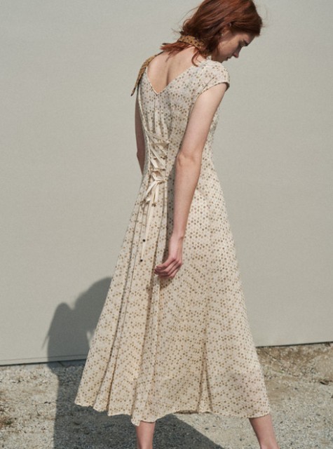 フロントとバックをVネックに仕立てた女性らしいワンピース。
